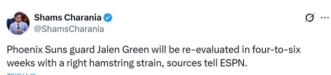 Shams的報道和之前太陽隊內(nèi)部記者甘巴多羅預(yù)測的時間表一致。即便格林能在4周后回歸,他仍將缺席球隊接下來的13場比賽。